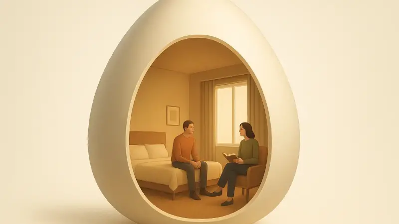 Egg shapes are not perfect spheres, so the focusing isn’t perfectly symmetrical. That’s part of why people describe it as strange rather than just echoey. The reflections can be uneven. A person near one end might hear a tight, quick slap-back. Another person across the room might hear a softer wash. It depends on where the bed, desk, and bathroom pod sit inside the shell.