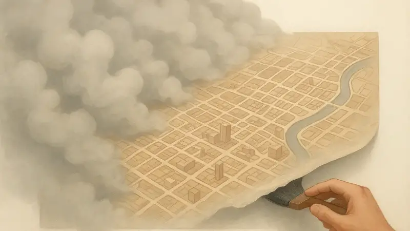 One detail people tend to overlook is that soot can create a false sense of “age” by muting contrast. It hides fine lines first. Thin outlines, hatching, and lightly glazed color shifts disappear before bold shapes do. So if an artist embedded a city plan using faint ink-like lines or pale washes, that information is exactly what smoke will erase from view first.